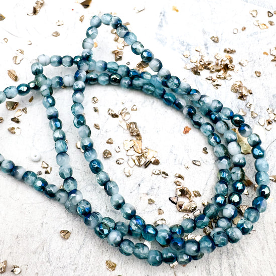 3mm Faceted Round Firepolished Slate Blue and White with Metallic Blue Finish Bead Strand