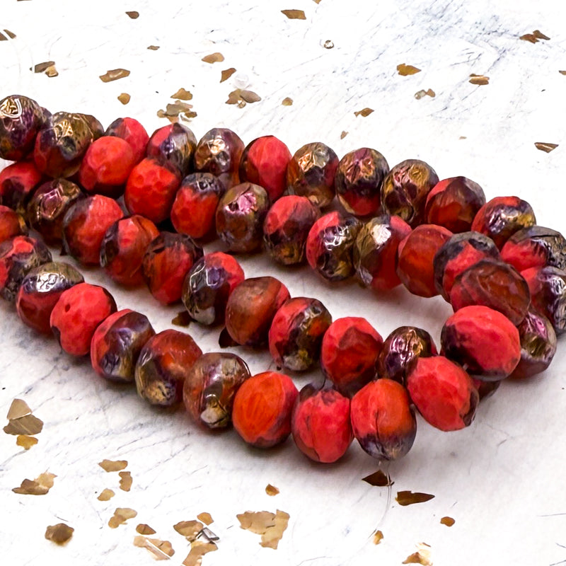 6x8mm Etched Ladybug Red with Copper Rainbow Finish Rondelle Czech Bead Strand