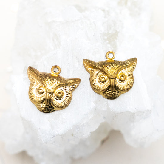 Owl Head Solid Brass Charm Pair