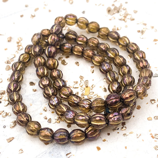 6mm Olive with Luster Finish and Gold Wash Faceted Melon Bead Strand