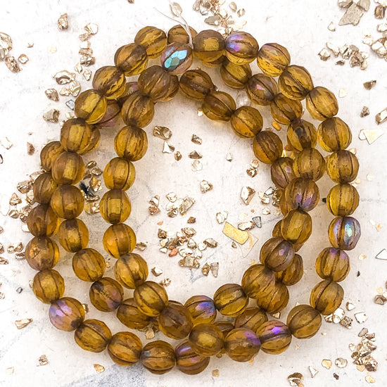 6mm Matte Amber with AB Finish and Bronze Wash Faceted Melon Bead Strand