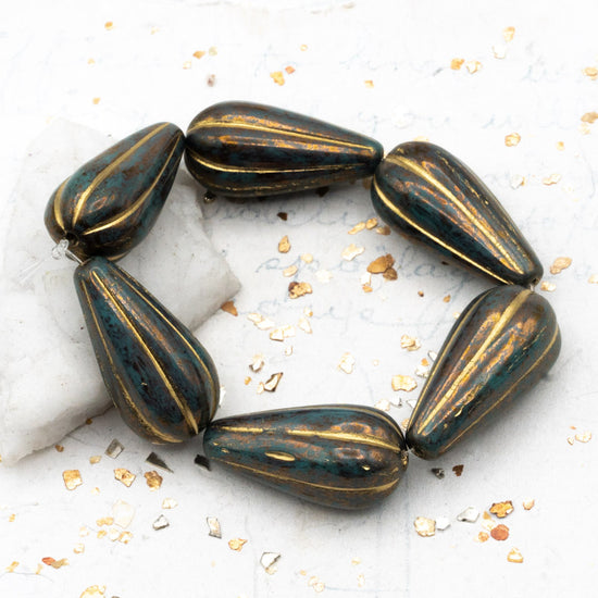 22mm Sea Green with a Gold Finish and Gold Wash Melon Drop Czech Beads