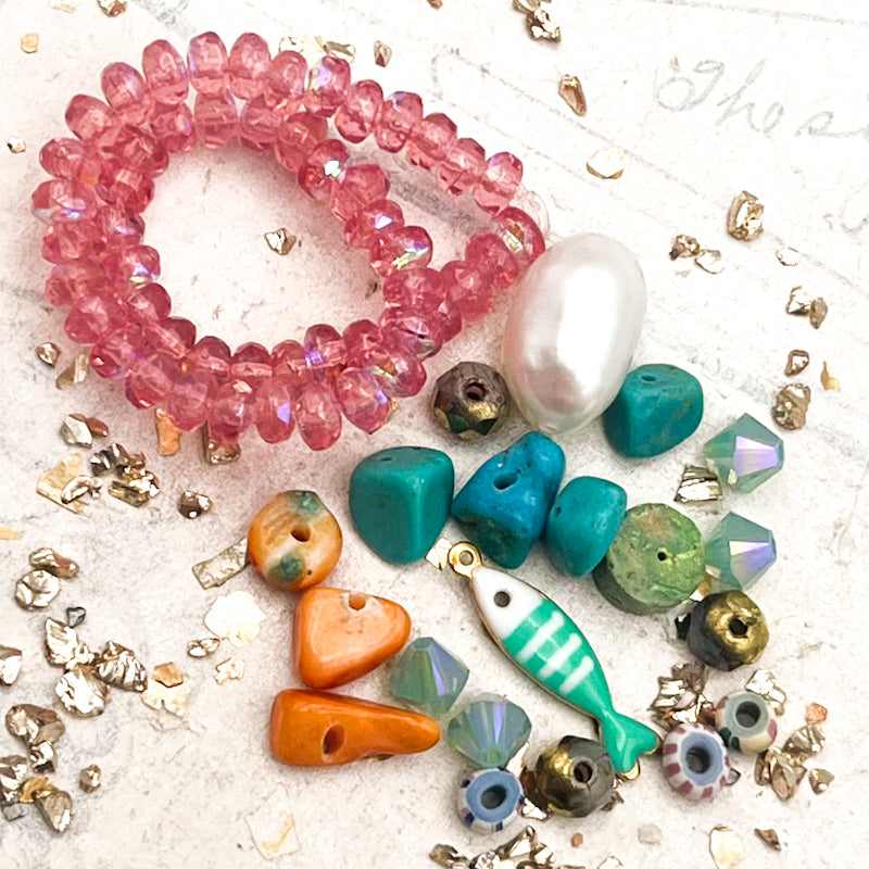 +Faceted Bead Strand, Rondelles, Pearl, Turquoise, Fish Charm, Premo Crystal, and African Beads.