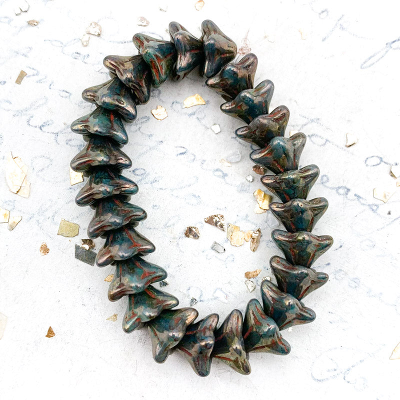 5x8mm Sea Green with a Heavy Bronze Finish Bell Flower Czech Beads