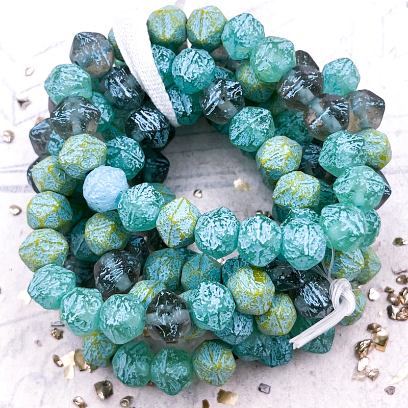 Pre-Order 8mm English Cut Bead Mix Yellow, Tea Green, and Pale Grey with Etched Finish and Turquoise Wash