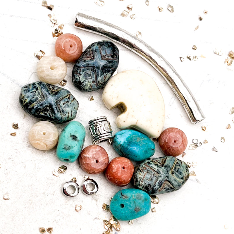 +In this mix, you'll get a bear focal bead, Czech glass beads; small, chunky turquoise beads, rondelle gemstone beads, metal spacer beads, and a long silver metal tube bead.