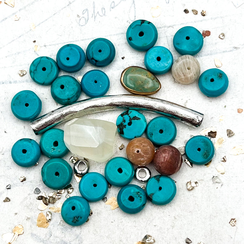 +You'll find moonstone, turquoise chips, and a large silver metal tube bead.