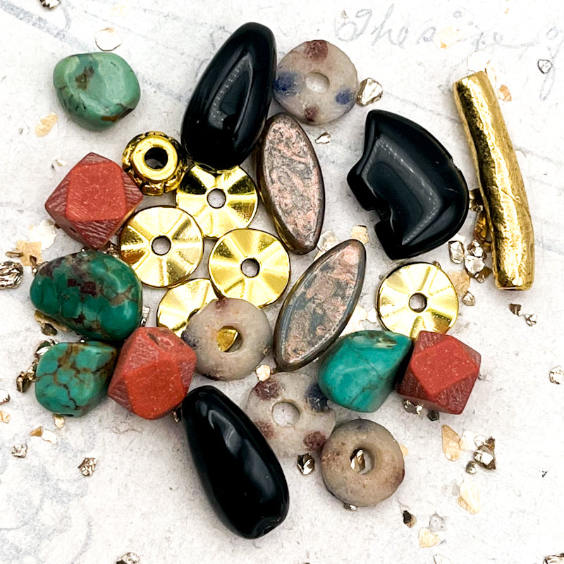 +This bead mix connects the bear bead with the gold, like light meeting strength. In this mix, you'll find an onyx bear bead, black onyx beads, antique gold tube bead, antique gold spacer beads, among other galaxy-looking beads.