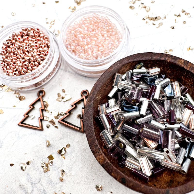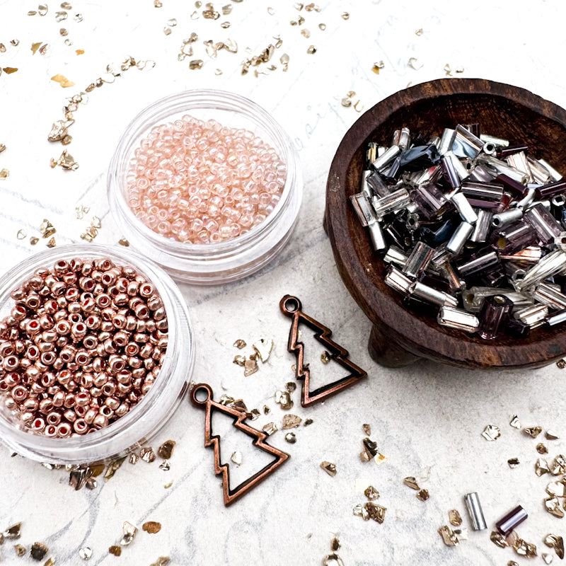 Listing is for 11/0 Czech and Bugle seed beads and 2 small copper tree charms